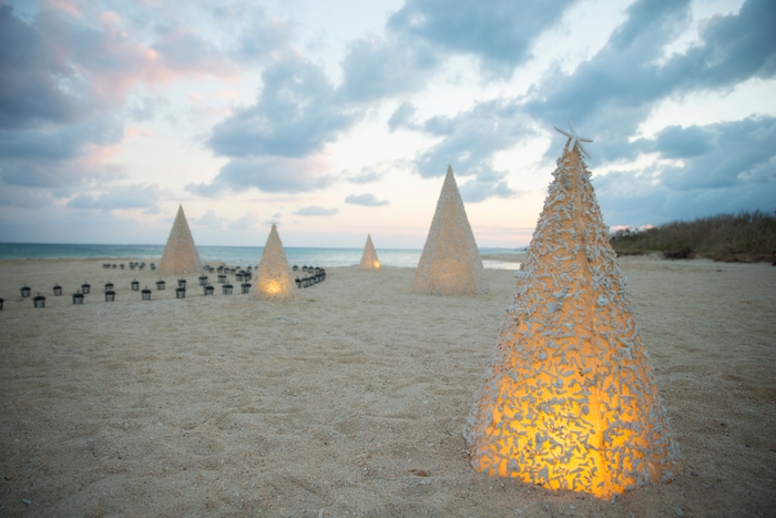 プライベート感のあるビーチには大小様々な大きさの珊瑚と白砂でできたクリスマスツリーが約20本立ち並びます。夜になると、こちらのツリーが点灯され、ビーチは一気に幻想的な雰囲気に包まれます。白砂のビーチに、キラキラと輝く珊瑚と白砂のツリーが南の島のホワイトクリスマスを演出します。