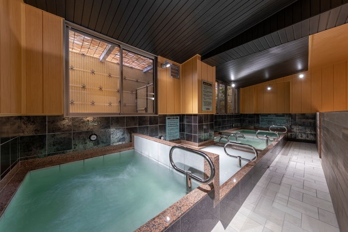脱衣所と内湯ではジャズのBGMが流れ、和モダンな空間が広がっています。