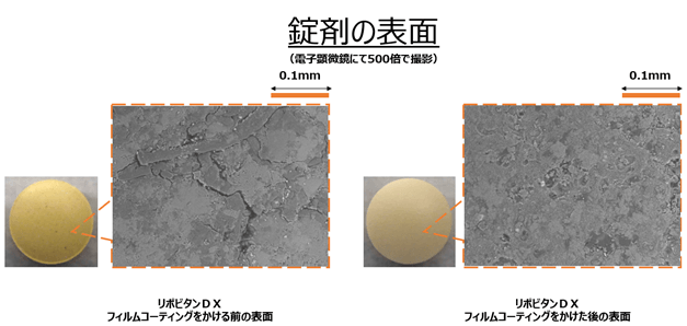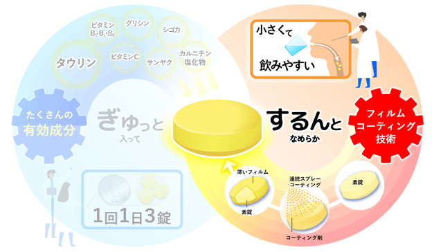 そこで、錠剤の飲みやすさを追求するために、【リポビタンDX】ではフィルムコーティングを採用しました。糖衣錠など他のコーティング方法にもそれぞれの良さがありますが、私たちは錠剤のサイズをできるだけ小さくすることを重視し、フィルムコーティングを選びました。さらに”するんと”飲みやすい感覚を目指して、水となじみやすい親水性のフィルム素材を使い、組成を何度も試作・改良。その結果、錠剤の表面はなめらかで”するんと”飲みやすい錠剤ができました。それぞれについて簡単に紹介します。
