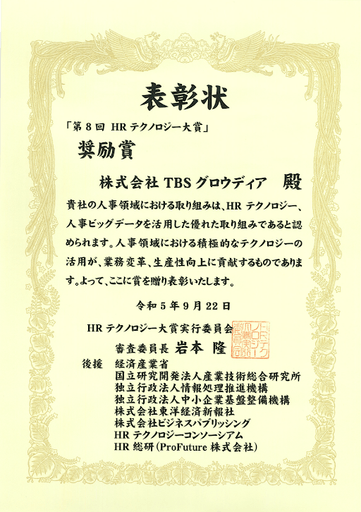 株式会社TBSグロウディア(東京都港区、代表取締役:園田憲)は、社内交流サイト「グロウディアずかん」にて、第8回HRテクノロジー大賞「奨励賞」を受賞し、9月22日に授賞式が行われました。