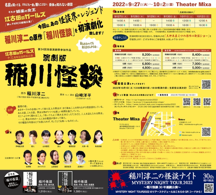 江古田のガールズ十三周年記念 特別公演 演劇版「稲川怪談」が2022年9月27日(火)~10月2日(日)にTheater Mixa(東京都豊島区)にて上演されます。チケットはカンフェティ(運営:ロングランプランニング株式会社、東京都新宿区、代表取締役:榑松 ⼤剛)にて7月29日(金)より発売開始です。