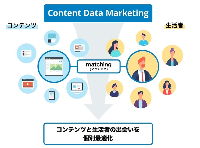 CDMは、多様なコンテンツを生み出す出版社を出自とする会社です。豊富なコンテンツを活かしてAIによる自然言語解析技術を磨き、コンテンツデータと生活者のデータをIDで結び付けて解析します。これによりレコメンデーションやマッチング等の精度を高め、新たなソリューションの提供を可能にします。