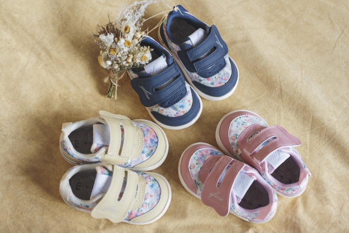 イフミーカランは、“かわいいをシェアする”というコンセプトの下、ママとお子様が共に納得するシューズを展開しています。人気の「wild flower series」は水彩画家の一栁綾乃さんのイラストを、タンネームにあしらい、リボンがポイントのデザインです。