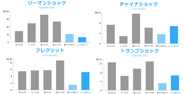 過去の代表的なショック相場において、豪ドル/円や英ポンド/円などのクロス円通貨ペアに比べ、あまり大きく下がることがなく、そこそこショック相場に強いと言えます。