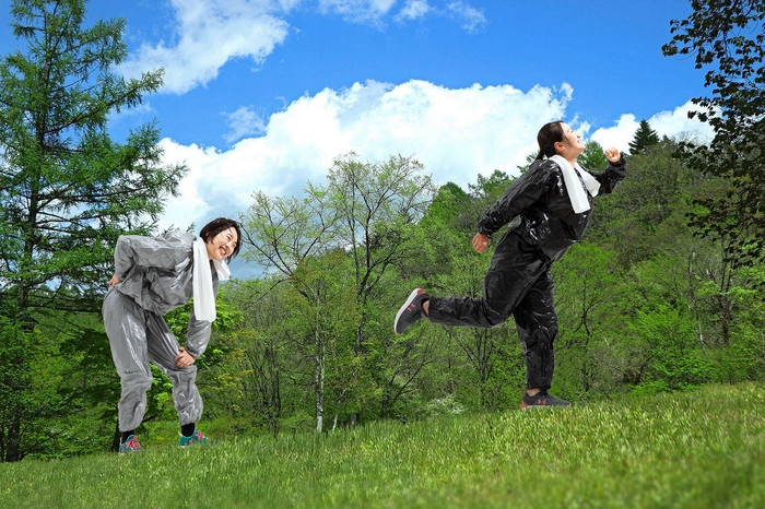 まずは、猛ダッシュをして汗をかきます。当館が位置する軽井沢星野エリアには、大きな広場や勾配約15~20%の坂があり、好みの場所で猛ダッシュが可能です。また、より一層汗をかきたい人のために、ホテル到着時に「軽井沢野鳥の森」を水源とした飲料水10リットルとサウナスーツをお渡しします。