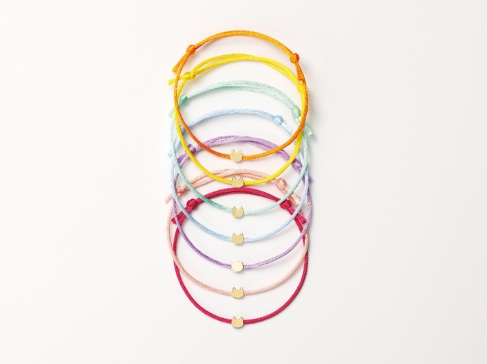 まんまるなお顔とピンと立った耳がキュートなネコのコードブレスレット。プレートの素材はK10YG10金イエローゴールド
