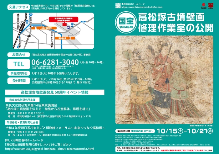 「国宝高松塚古墳壁画修理作業室の公開(第39回)」事務局ホームページまたは、事務局に連絡の上、定員に達していない日時から御応募ください。