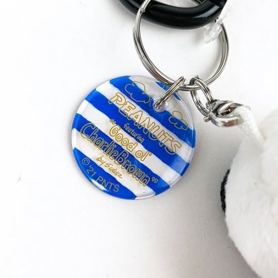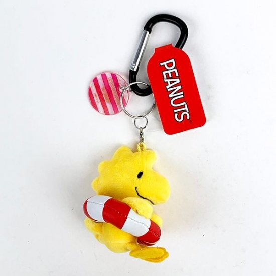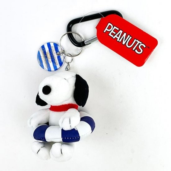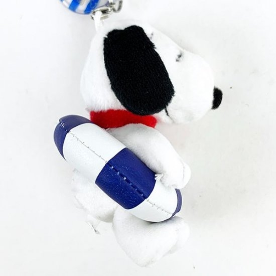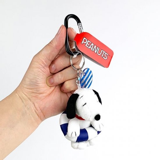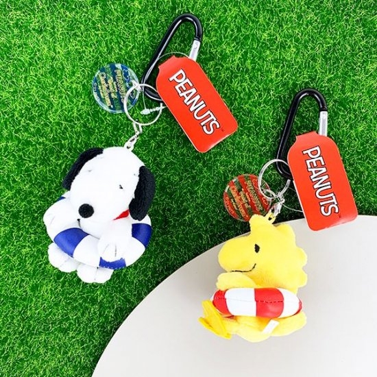 夏はやっぱボーダーで決まり♪スヌーピー&ウッドストックのサマーマスコットは涼し気なアクリルチャーム付きで浮き輪。