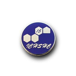 異なる2種類のタイプが揃ったアイテムは「学会記念ピンズ・タイバー」。濃紺とニッケルメッキのシルバーでアッサリ仕上げた完成品は、海外からのお客様も集う学会のアニバーサリーグッズです。デザインのモチーフになっているのは「ステロイド骨格」だそうで、学会の略称である「ICHSHC」と開催の回数も添えられました。仕様を2つに分けたのは出席者が男女混成だから。世界各国の専門家が一堂に会して行われるイベントを、合成七宝の美しい記念品も盛り上げてくれたようです。