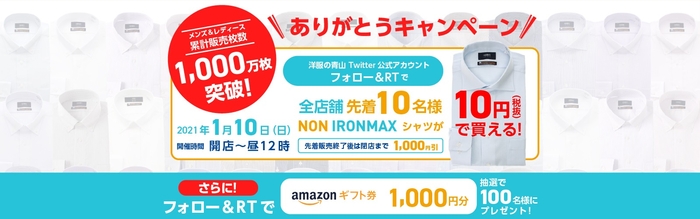 本キャンペーンでは、12月17日(木)から2021年1月9日(土)までの期間に「洋服の青山」の公式Twitterアカウント(@AoyamaOfficial)をフォローし、キャンペーン告知をリツイートいただいた方限定で、2021年1月10日(日)に「洋服の青山」全店(アウトレット店舗は除く)で、通常価格4,900円(税抜)~5,900円(税抜)のノンアイロンマックスシャツ(メンズ・レディス)を各店先着10名様に1枚10円(税抜)で販売します。さらに、フォロー&リツイートいただいた方の中から抽選で100名様に「Amazonギフト券 1,000円分」をプレゼントします。