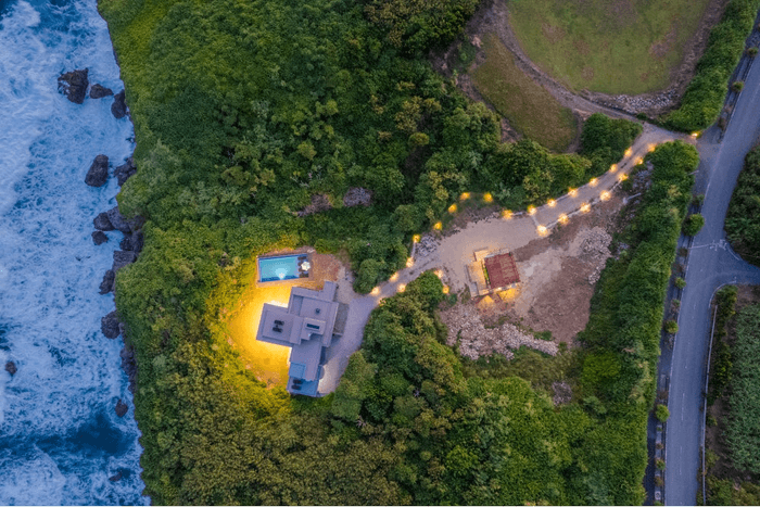 敷地に入ると視界に広がるのは海と空と木々の自然のみという贅沢な空間。
