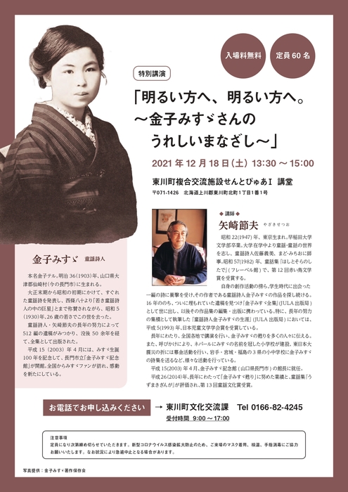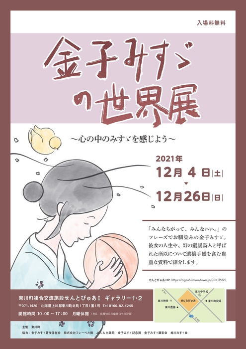 北海道 東川町は、12月4日(土)~12月26日(日)までの期間で、東川町複合交流施設せんとぴゅあⅠギャラリーにて、「金子みすゞの世界展~心の中のみすゞを感じよう~」を開催します。