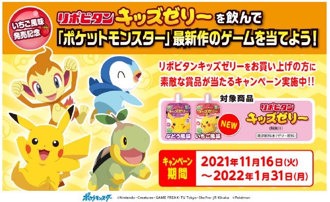 また今回、「リポビタンキッズゼリー いちご風味」の発売を記念して、「リポビタンキッズゼリー」を購入すると、Nintendo Switchのゲームソフト『ポケットモンスター ブリリアントダイヤモンド』『ポケットモンスター シャイニングパール』や関連グッズが抽選で合計1,400名様に当たるキャンペーンを11月16日(火)より実施いたします。「リポビタンキッズゼリー」を飲んで素敵な賞品をゲットして下さい。