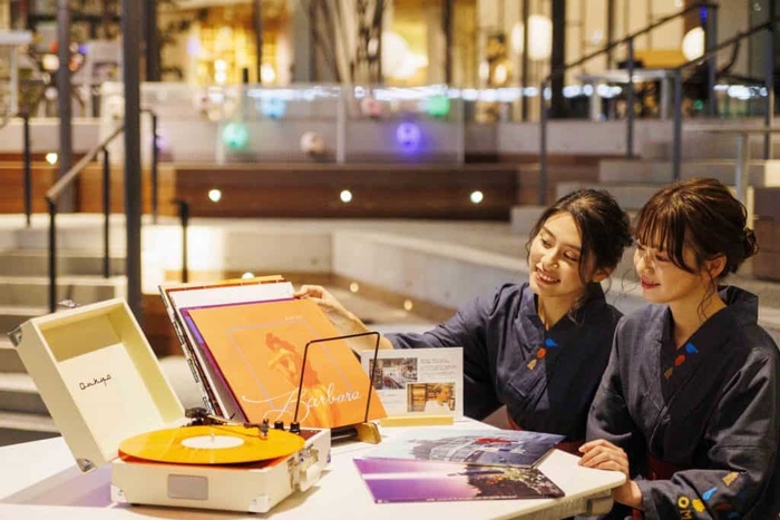 みやぐりん内、6か所にレコードプレーヤーと、レコードショップの店主さんがセレクトしてくださったレコードを設置します。年齢も趣向もさまざまなレコードショップの店主が選んだ「大阪」をイメージした曲が揃っており、お客様自身で好みのレコードを流せます。6か所に用意しているレコードはそれぞれ異なる曲のため、煌めくネオンアートを見ながら巡って、お気に入りを見つけるのもおすすめです。