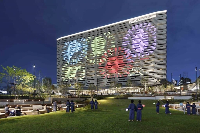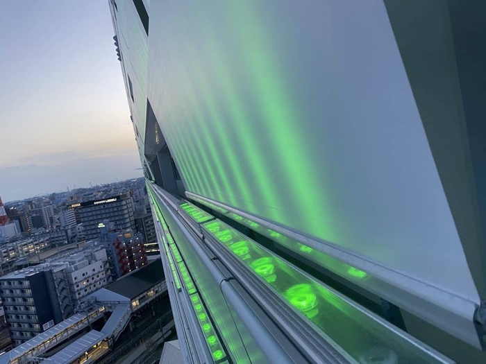 当ホテルの建物の壁面を覆うように、外装には5,265枚の白い膜を張っています。この外装膜へ、調光・調色をした約13,000個のLED照明の間接光を線状照射で当て、映像として見せる演出(*1)は日本初の試みです。この演出は、LED照明を壁に直接当てて映像化する手法で作られる一般的なプロジェクションマッピングとは異なり、間接的に光を当てるため、光源が目に入らず、柔らかな見え方となるのが特徴です。