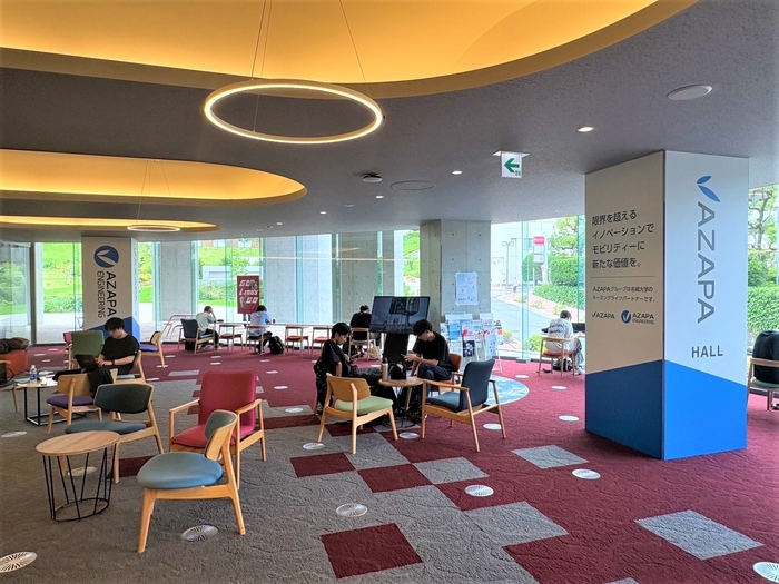 「AZAPA HALL」は、2022年3月に竣工した研究実験棟Ⅳ 1Fにあり、同棟を主に利用する理工学部(メカトロニクス工学、交通機械学、機械工学、材料機能工学)の学生のグループ学習や憩いの場として人気のスペースです。