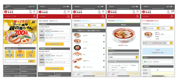 モバイルオーダー機能は、『幸楽苑』の対象店舗(全国220店舗)で運用を開始しており、店舗選択・商品選択・店頭決済・商品受取の4ステップでご利用いただけます。一部店舗では、駐車場受取りのサービスに対応しており、お客様が駐車場に到着しチェックインすると、店舗従業員がお客様の車へ商品をお届けします。