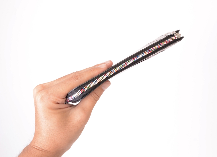 本製品は全面にタイヤチューブ素材を使用し、ワンアクションで開くことができるL字ファスナーを搭載した長財布です。一般的な長財布と比べとても薄く作られており、その薄さは15mm。余計な革を省きシンプルな構造にすることでこの薄さが実現しました。ポケットへの出し入れも行いやすくどんなスタイルでもスムーズに会計を行うことができます。
