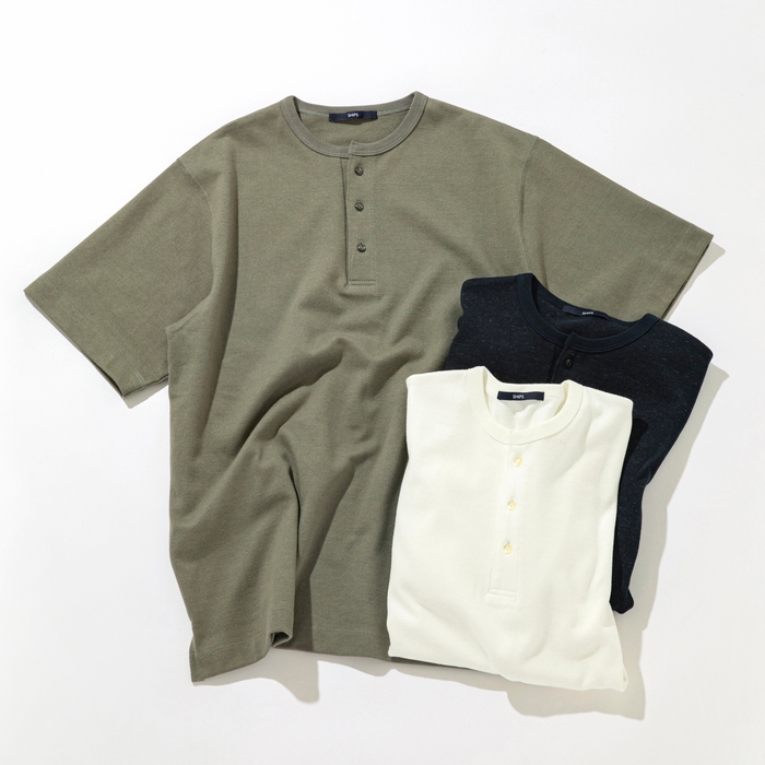 3つボタンのヘンリーネックTシャツ。ヘビーウェイトの天竺素材で、ワーク由来のディテールながら、ジャケットなどにも合わせやすいデザインです。