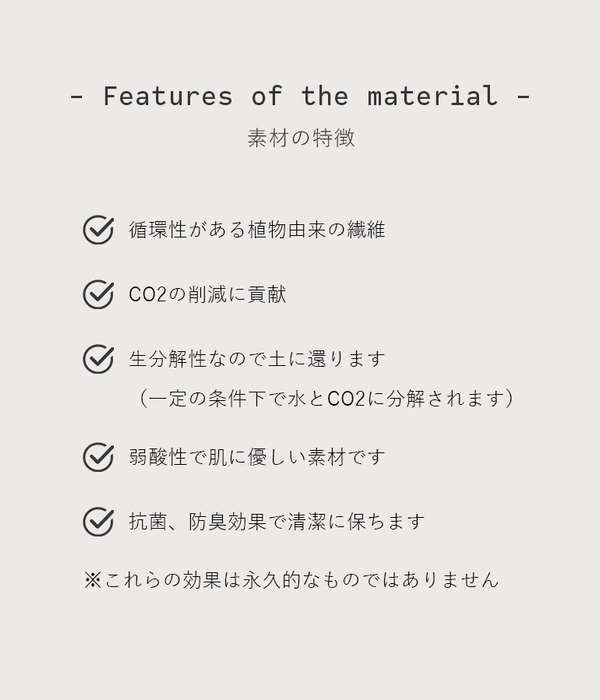 トウモロコシやサトウキビを原料としたPLA(ポリ乳酸)は、原料製造時のCO2排出量の削減に貢献。使用後は一定の条件で水とCO2に分解される生分解性の特徴を持つ、石油に依存しないバイオベース素材です。また環境配慮だけでなく、肌に優しい弱酸性や清潔に保つことができる抗菌・防臭効果も兼ね備え、人にも優しい次世代のサステナブル素材として注目されています。