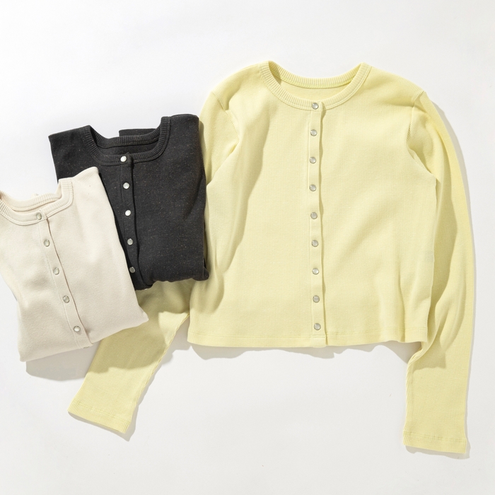 ボトムスとのバランスが取りやすいやや短丈のリブカーディガン。パールのドットボタンがさりげないアクセント。