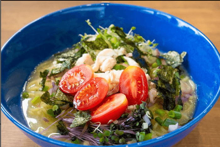 自家製の梅酢をベースにしたさっぱりスープに、ほぐした鶏肉と香り豊かな薬味をたっぷりと。〆は追加ごはんと温かい出汁で、お茶漬け風に楽しめます。