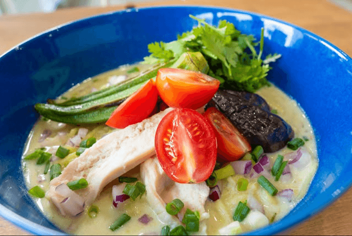 グリーンカレー風のスパイシーなスープに、低温調理した鶏と季節の焼き浸し野菜をトッピング。〆には残ったスープにごはんを加えるのもおすすめです。