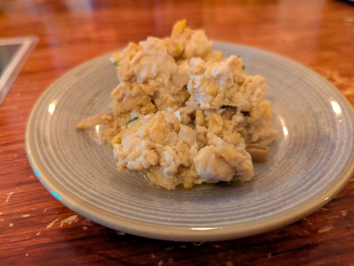 太めの麺を特製だれで和え、手作りベーコンと香ばしい焼きネギをのせた一杯。お好みで一味や山椒を加えれば、さらに奥行きのある味わいに。
