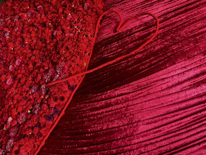ハート型オブジェの左右で異なる素材を用いた象徴的な造形。 片側は生花で命の息吹と感情の豊かさを表現、もう片側はベロア素材のドレープで優雅さと深みを演出。赤い糸のオーナメントをハートの中心を貫くように配置し、「つながり」や「運命」を視覚化。来場者に作品を通して“見る・感じる・撮る”体験を提供し、記憶に残る演出に。