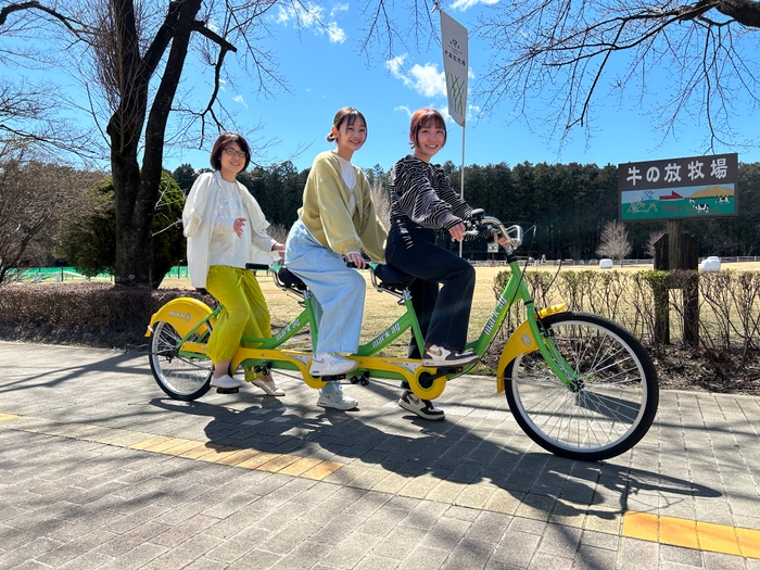 園内には自転車で巡れるコースが整備され、新緑と桜並木に包まれたルートを走りながら、どうぶつふれあい広場や牧場内各所へアクセス可能。春風を感じながら牧場をのびのび楽しめるアクティブな体験として、ご家族やカップルに人気のアクティビティです。