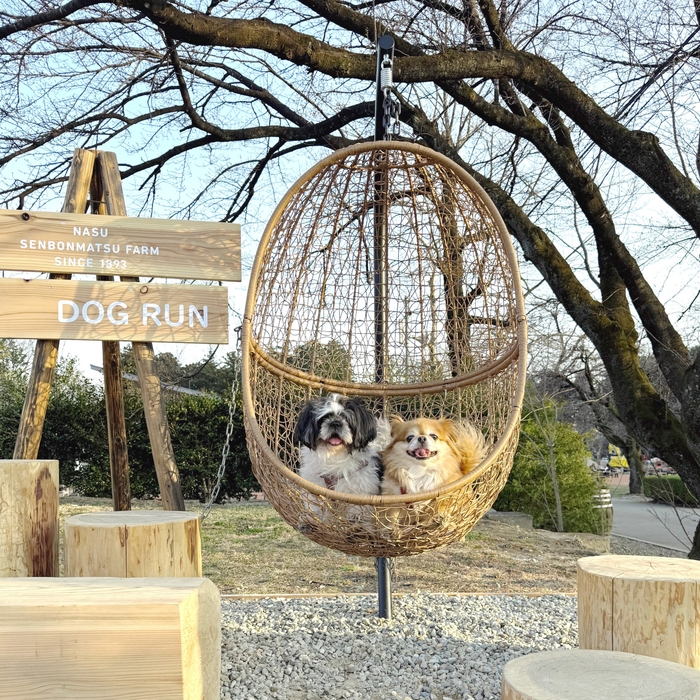 全面芝生、ヒメシャラの木陰、足洗い場、日よけスペース、フォトスポットも完備。ファームレストランのパラソル席ではワンちゃんと一緒にお食事も楽しめます。