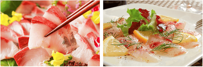左:別府湾朝どれのお造りは、9月は大分豊後ぶり、10,11月はかぼすブリをお楽しみください。