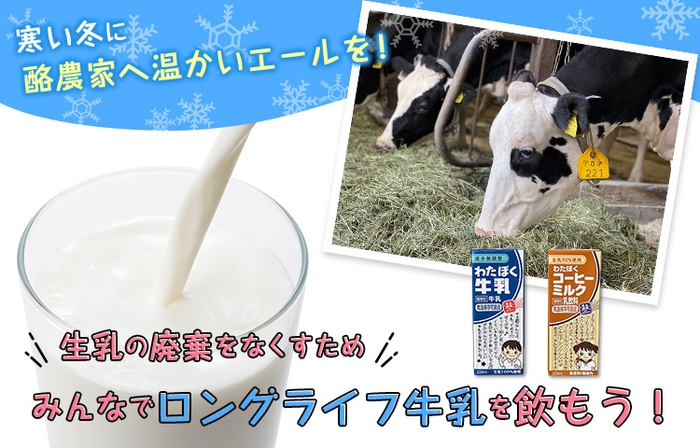 本プロジェクトは広域指定生乳生産団体である関東生乳販売農業協同組合中央酪農会議が実施する「令和3年度牛乳等冬季需給対応事業」より助成を受けております。より多くの牛乳を皆さんに飲んでいただくために、リターン品1ケースにロングライフミルクコーヒー1ケースを同梱し、2ケースセットでお届けします。