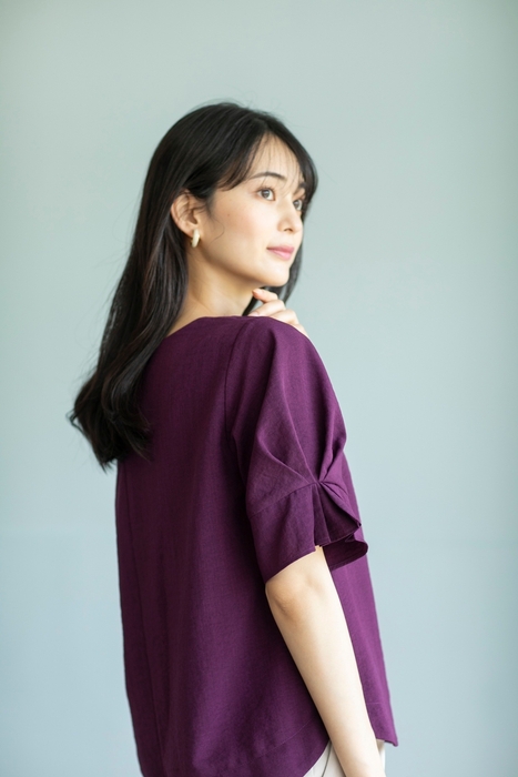 発売から3シーズン目となる今年、累計販売数8万枚を突破した人気のタックスリーブブラウスは、これからの季節に向けて嬉しい機能付きの麻調合繊素材“タンブラーブッチャー”を使用した、オン・オフ共に活躍するアイテムです。