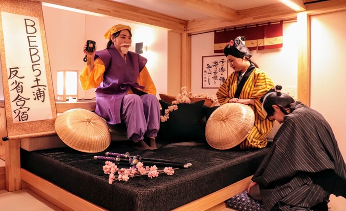 ヤグラルームを、茨城が誇る反省の達人にちなんだ反省部屋にアレンジしました。ヤグラルームの広いソファ、小上がりのテーブルを江戸時代の法廷に見立て、反省合宿への気持ちが高まる特別な設えにしています。