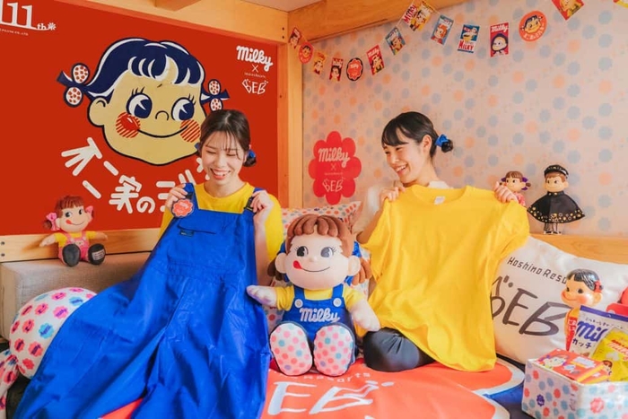 不二家のペコちゃんをイメージした、トップスとオーバーオールのセット「ペコちゃん仲良しコーデセット」を客室にご用意。日常では挑戦しづらいコーデも、仲間と一緒なら楽しめるはず! パブリックスペース「TAMARIBA(タマリバ)」でくつろいだり、周辺観光にお出かけしたり、記念撮影をしたり、楽しみ方は自分たち次第!