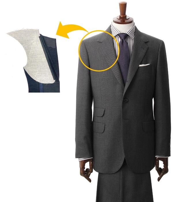 柔らかくソフトな芯地を使い、胸元から肩の後ろまで毛芯を延長することで、軽く軽快な着用感に仕上げつつ胸元のボリュームを維持しています。
