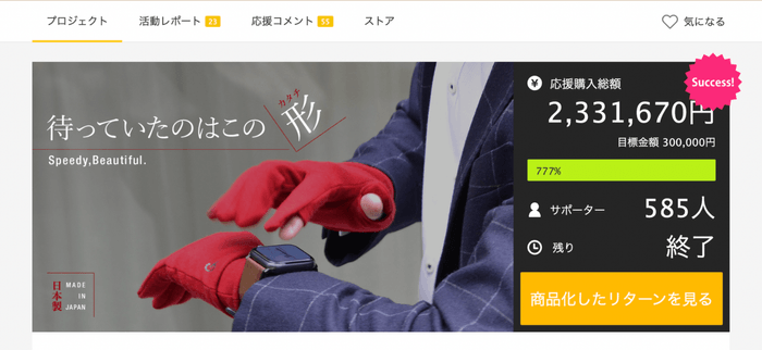 Makuakeにてプロジェクト公開初日で126人のサポーターにご支援いただき目標を達成し、最終的には585名と大変多くの方々にご支援いただくことができました。