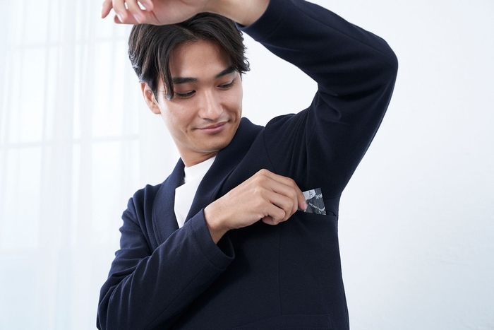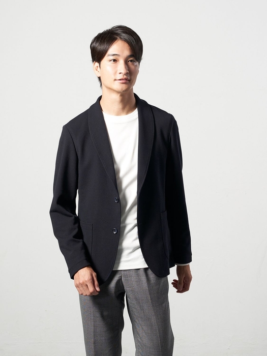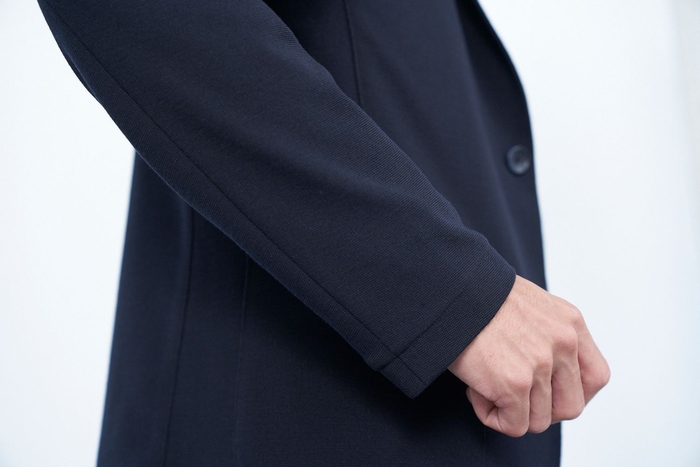 このようにして完成した今回のテレワーカー向けジャケットは、見た目の「きちんと感」と動きやすく快適な着心地の「過ごしやすさ」を両立しました。生地は「リモート会議できちんと見せたい」という意見から編み目の詰まった上品な表面感と適度な厚みが特徴のサーフニット生地を採用。ハリがあるので襟崩れがしづらく、光を反射しにくいのでモニター越しでもテカリが生じず、落ち着いた印象になります。ジャケットの腕回りやウエスト周りはゆとりをもたせ、着丈を短めにする他、袖部分のボタンをなくすなどコミュニティメンバーの声を反映し、リラックスして仕事ができるようなデザインにしました。また、裏地は涼感素材を使用しており、着用時の快適性を保ちます。