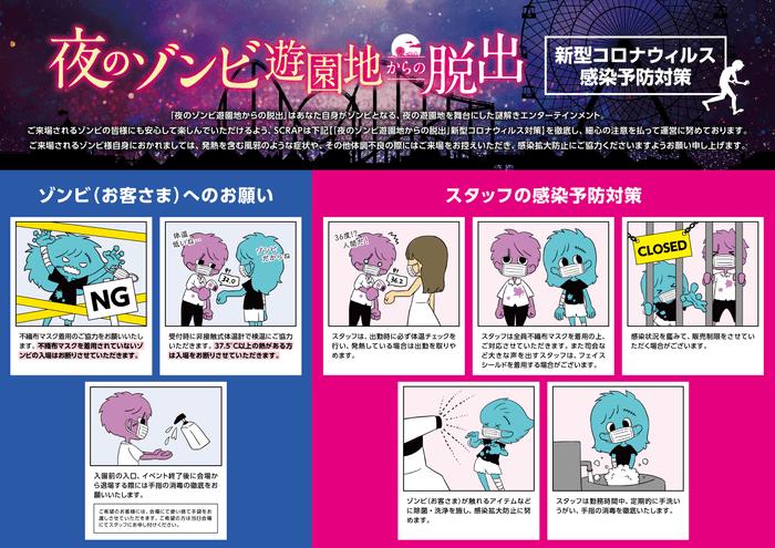 本イベントでは、独自に設定した【「夜のゾンビ遊園地からの脱出」新型コロナウイルス対策】を徹底し、細心の注意を払って運営に努めてまいります。