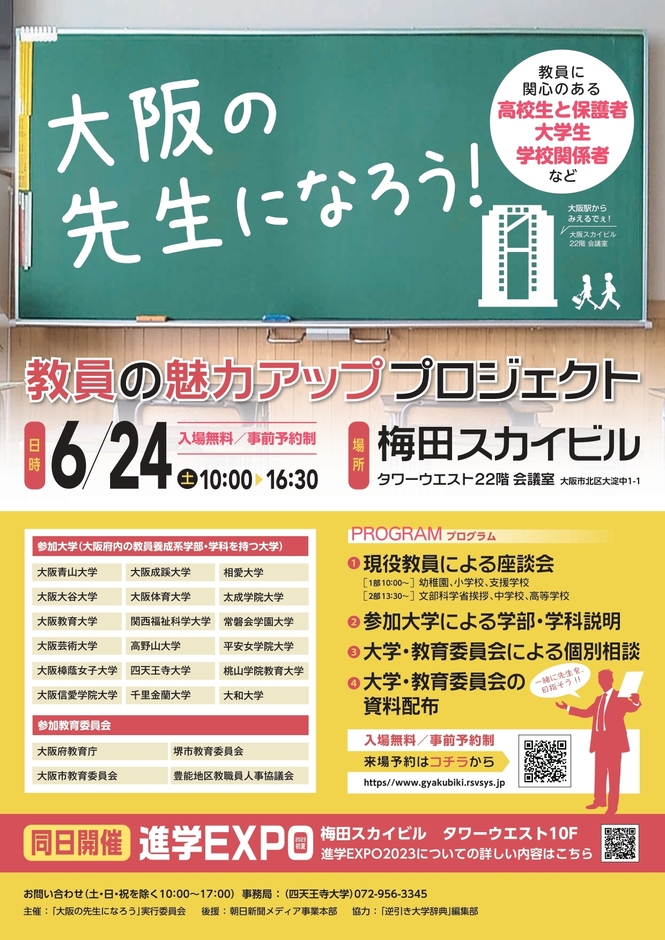 四天王寺大学(大阪府羽曳野市)の「大阪の先生になろう」実行委員会は、大阪の学校教育を豊かにすることを目的とした、教員をめざす高校生および大学生の進路支援プロジェクトを、令和5年6月24日(土)に梅田スカイビルにて開催します。