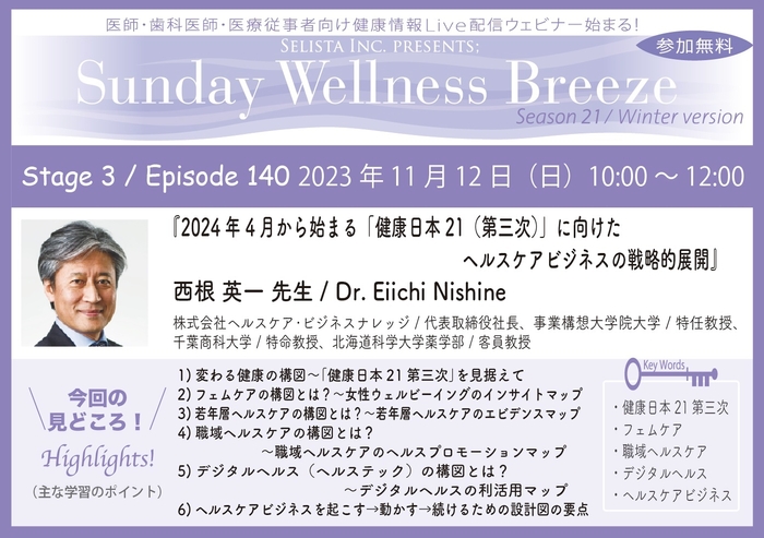 セリスタ株式会社(東京都千代田区 代表取締役 伊藤 承正)は、2023年11月12日(日)に、西根 英一先生(株式会社ヘルスケア・ビジネスナレッジ/代表取締役社長、事業構想大学院大学/特任教授)を講師にお迎えし、医師・歯科医師などの医療従事者向け無料Zoomオンラインセミナー『2024年4月から始まる「健康日本21(第三次)」に向けたヘルスケアビジネスの戦略的展開』を開催します。