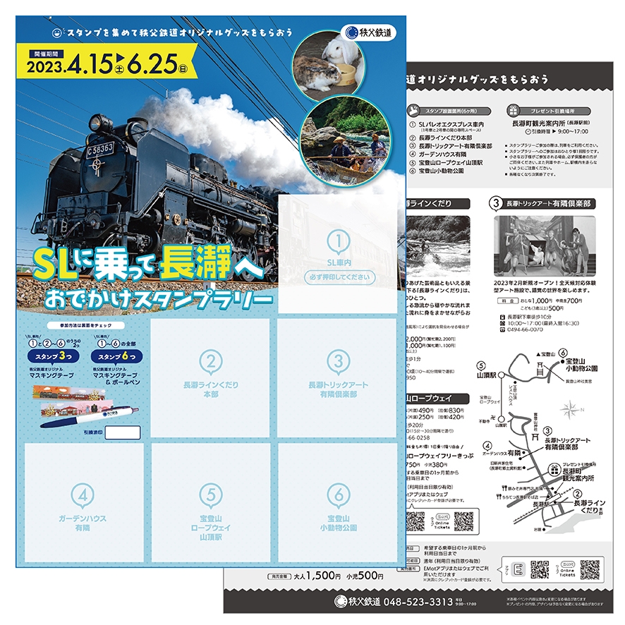 - 専用台紙にSL車内スタンプを押印し、長瀞地域の指定施設の利用時にスタンプを押印してください。