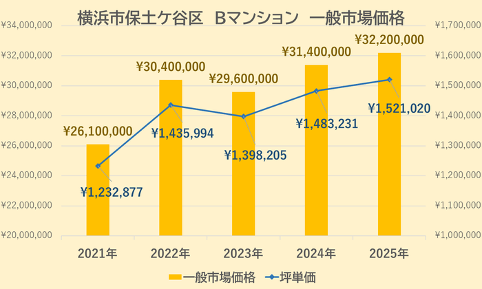 Bマンションの一般市場価格・坪単価の推移は上記【図4】の通りです。