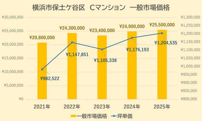 Cマンションの一般市場価格・坪単価の推移は上記【図5】の通りです。