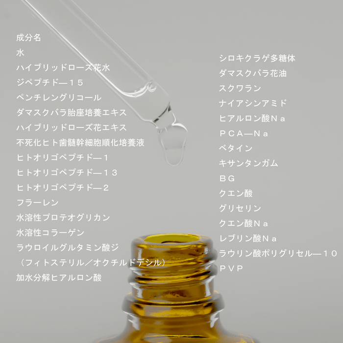この美容液には、業界初となるブルーローズウォーターが配合されており、肌にのせた瞬間、まるでバラそのものに包まれているかのような、優雅で心地よい香りが広がります。さらに、不死化ヒト歯髄幹細胞順化培養液が肌のスキンフローラを整え、ターンオーバーを促進。内側から輝くような美しい肌へと導きます。