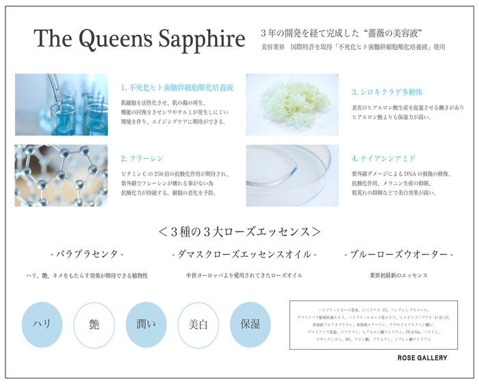 その結果、3年にわたる開発の末に誕生したのが、ローズギャラリーの「The Queen’s Sapphire」Be Rose SHIZUKUです。私たちが扱うバラの持つ美と癒しの力を、最先端のアンチエイジング成分と融合させることで、これまでにない特別な美容液を生み出すことができました。