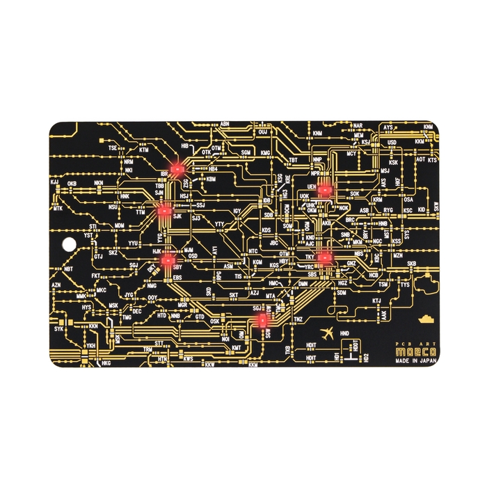 基板CADで、表は東京回路線図(または関西回路線図)デザイン、裏は基板デザインを設計しました。基板の配線パターン(金メッキ)で路線図をデザインしています。飛行場には飛行機マーク、海には大型船が浮かんでいます。
