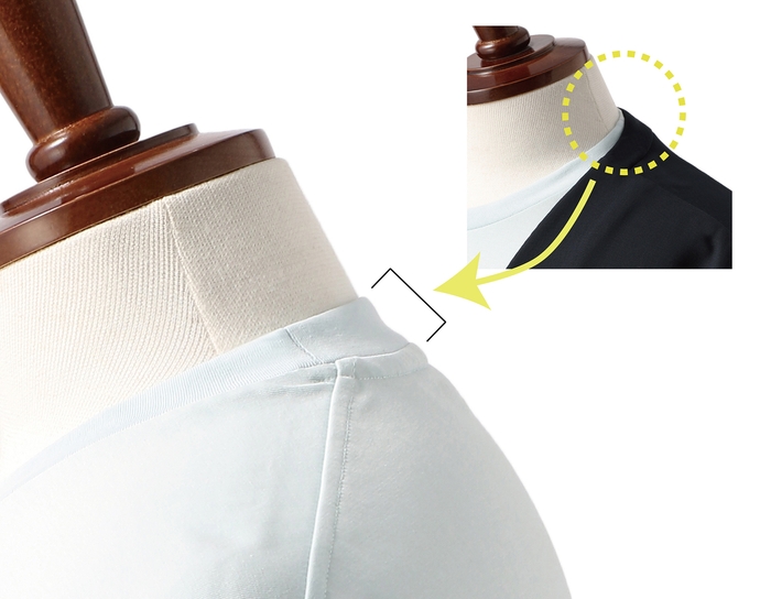 “ビジカジ”スタイルの浸透とともに、夏場の軽装アイテムとしてTシャツが注目されています。“すごシャツ”として今回発売するビジネスTシャツは、ジャケットのインナーとして取り入れやすい仕事向きなデザインが魅力です。ネック回りの開きを抑え、Tシャツの着丈はジャケットの着丈から出ないよう短めに設定。袖部分にはビジネスシャツの形状を取り入れ、当社の一般的なカジュアルTシャツより長めに、また細身に設計して腕回りの余分な“だぶつき”をなくすことで、全体的にすっきりとした印象に仕上げています。さらに、一部の商品では襟後ろをやや高くし、ジャケット着用時に気になる襟裏の汚れを防ぐといった工夫も施しています。