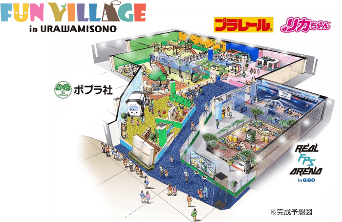 同店は、ポプラ社が出版する絵本の世界を様々なコンテンツとして体験できる、常設店としては国内初の「FUN VILLAGE with ポプラ社」をはじめ、タカラトミーの玩具ブランドを使用した店舗として国内4店舗目となる「FUN VILLAGE with プラレール・リカちゃん」、新ジャンル“フィジカルeスポーツ”を体験できる「リアルFPSアリーナ」の3つのコンテンツを展開。隣接する「GiGOイオンモール浦和美園」と合わせて様々なイベントもご用意し、ファミリー中心に幅広いお客さまが1日中楽しめる、来るたびに新しい発見がある店舗づくりを目指してまいります。